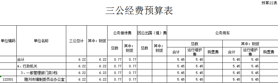 2016年市编办“三公”经费预算6.22万元,比上年减少10.53万元,减少 169.29%。其中:因公出国(境)费0万元,去年为5万元;公务接待费0.77万元,比上年增加0.05万元,增加6.49%;公务用车费5.45万元,比上年减少5.58万元,减少102.39%(其中:公务用车运行维护费5.45万元,无公务用车购置费预算)。