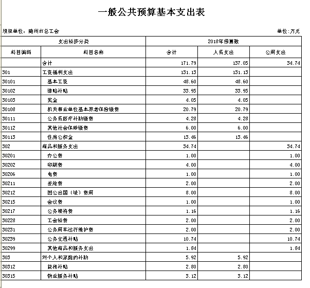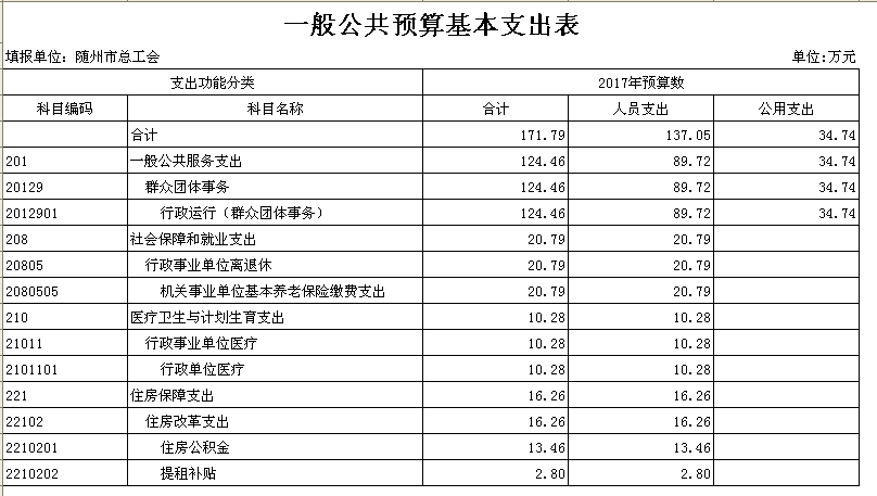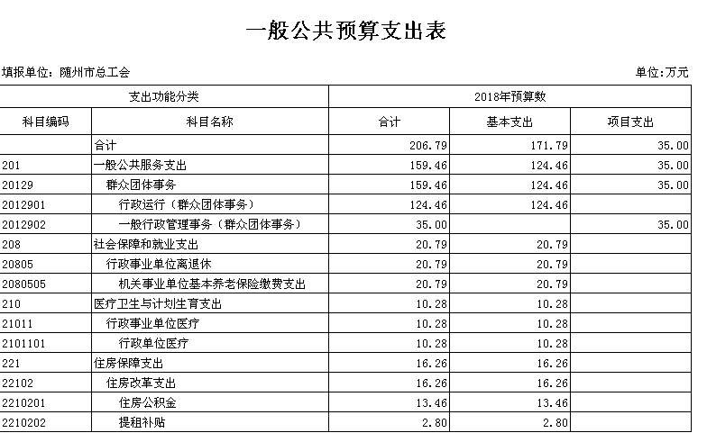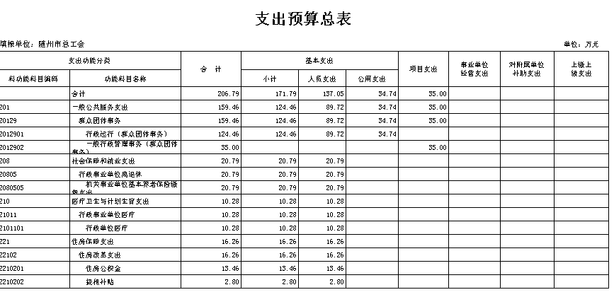 本年部门支出预算总额206.79万元,其中:行政运行(群众团体事务)预算金额124.46万元(其中人员支出89.72万元、公用支出34.74万元)、一般行政管理事务(群众团体事务)预算项目支出35.00万元、机关事业单位基本养老保险缴费支出预算人员支出金额20.79万元、行政单位医疗预算人员支出金额10.28万元、住房公积金预算人员支出13.46万元、提租补贴预算人员支出2.8万元。较上年预算安排减少了139.14万元,比上年预算安排减少了40.22%,主要是退休人员的工资纳入社保统筹,人员经费减少和部分项目经费降低;