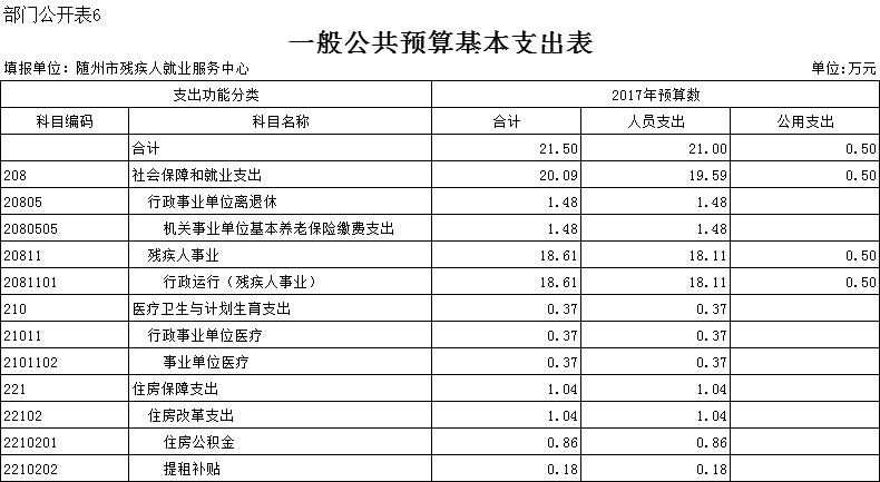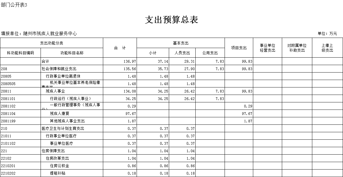 2081101 社会保障和就业支出(类)残疾人事业(款)行政运行(项):指市残疾人就业服务中心的基本支出。