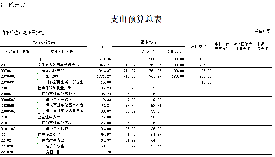 2019年随州日报社支出预算总额为1573.35万元,比上年减少76.84万元,下降4.7%,按经济分类工资福利性支出979.03万元;对个人和家庭补助支出9.32万元;商品与服务支出180万元;其他资本性支出405万元。按功能分类文化体育与传媒预算支出1346.27万元,社会保障和就业预算支出135.23万元,医疗卫生预算支出26.88万元,住房保障支出预算64.97万元。减少主要原因为2018年单位搬家已完毕,2019年商品与服务支出相比去年减少较多。