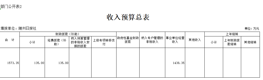 2019年随州日报社收入预算总额为1573.35万元,比上年减少76.84万元,下降4.7%,其中财政拨款135万元与去年相同,事业单位经营收入1438.35万元比去年减少76.84万元。减少主要原因为附属子公司经营状况受限,上交任务款延后。
