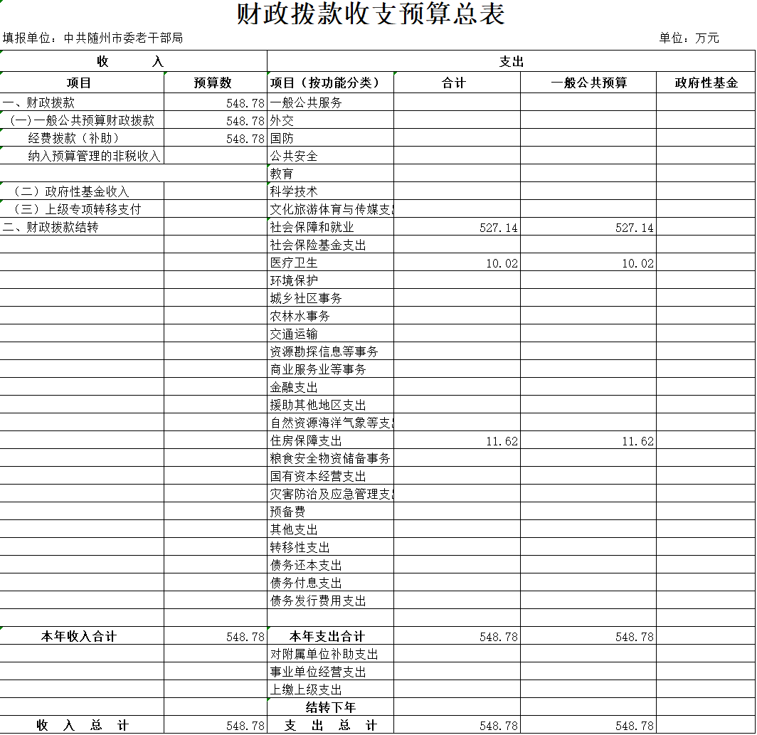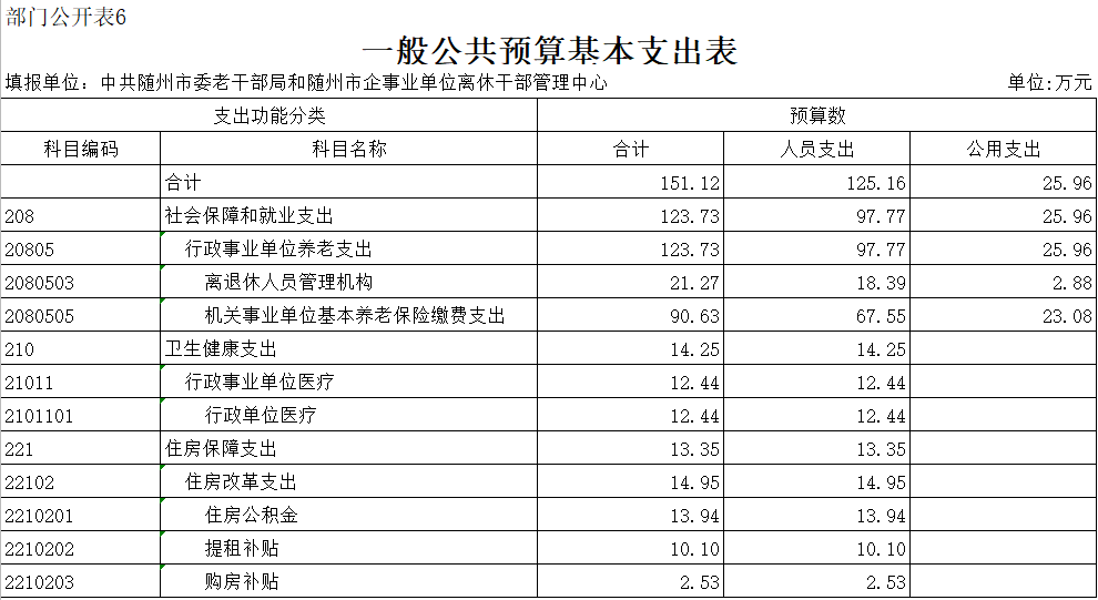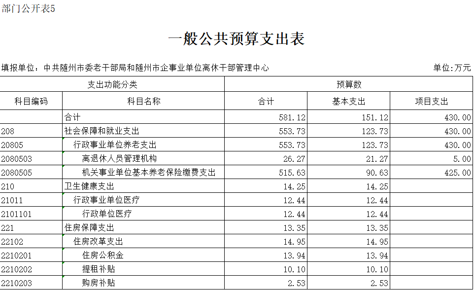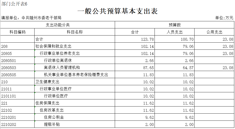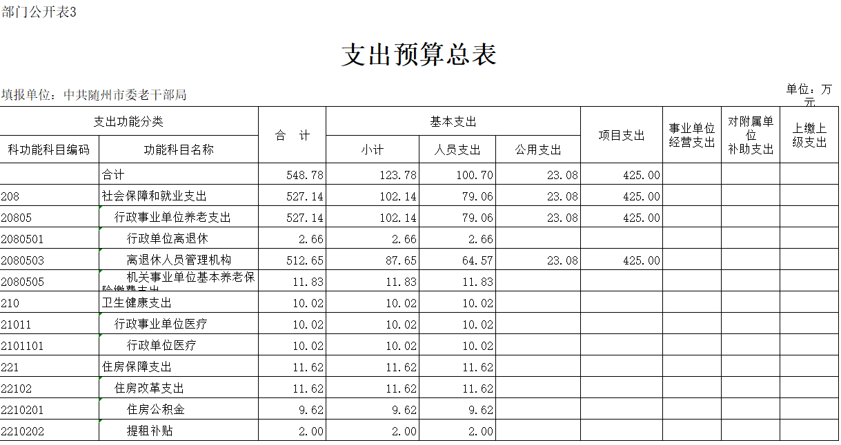 8.行政单位医疗(2100501项):反映财政部门集中安排的行政单位基本医疗保险缴费经费,未参加医疗保险的行政单位的公费医疗经费,按国家规定享受离休人员、红军老战士待遇人员的医疗经费。