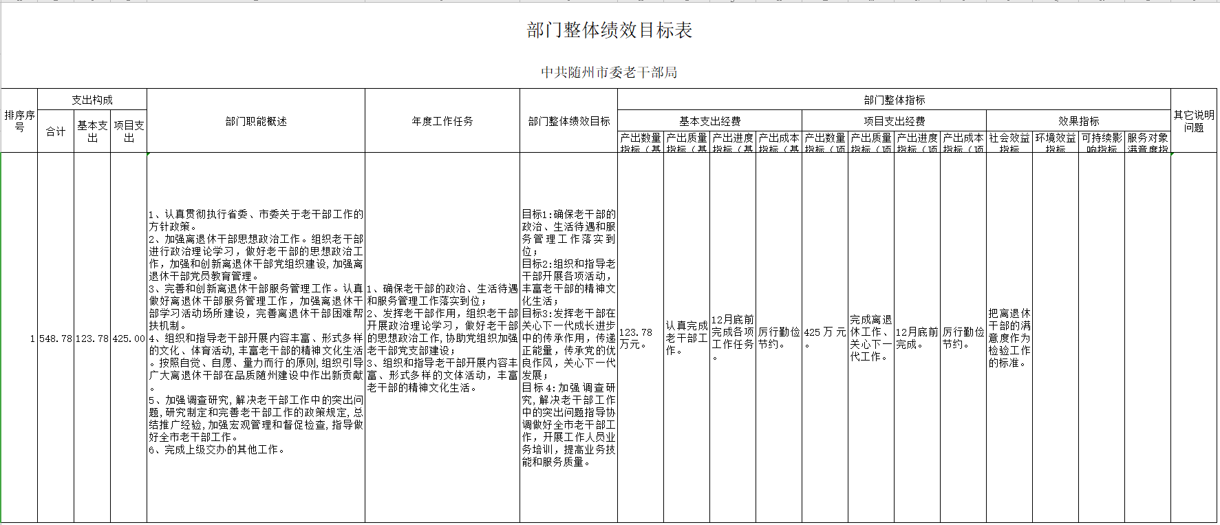 2020年市委老干部局整体绩效目标是根据部门主要职责编制,制定细化明确的预算绩效目标和可考核、可量化的绩效指标,并加强对绩效目标的审核,将其作为预算编制和资金安排的前置条件和重要依据。加强对支出效果和资金使用绩效的监控,将预算绩效评价结果作为预算安排的重要依据。