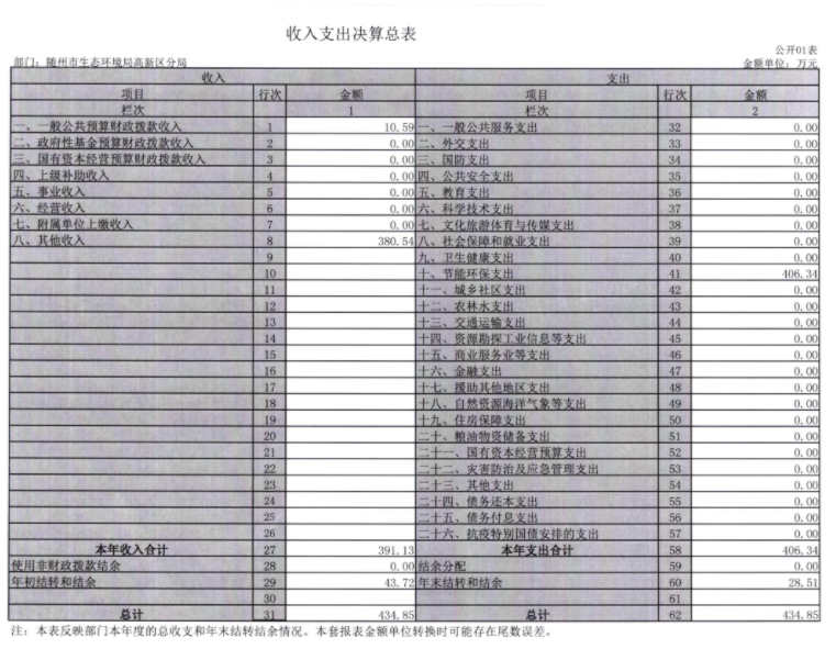 2020年高新区分局总收入434.85万元,其中财政拨款收入10.59万元,其他收入380.54万元,年初结转和结余43.72万元。比上年决算收入增加54.29万元,增幅14%。主要原因是节能环保支出拨付增加。