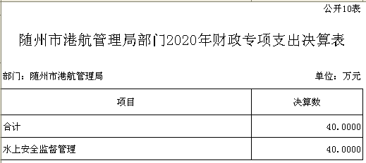 2020年财政专项支出涉及项目1个,项目名称:水上安全监督管理。该项目资金在年度内全部执行完毕,预算数为40万元,决算数为40万元,完成年初预算的100%。