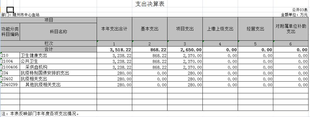 全年预算支出4242.01万元,实际支出3518.22万元,使用本级一般公共预算财政拨款资金230.63万元、政府基金财政拨款(抗疫特别国债)280万元、政府一般债券916万元、新冠疫情上级转移支付466万元、接受捐赠186.8万元(其中:指定用途的货币资金105.8万元,采送血车三辆81万元)。资金拨付到位及时,按照专款专用的原则保障重点支出,力求将资金用于血站的创新发展和能力建设方面,全力保障随州地区的血液供应和血液安全,血液标本核酸检测全覆盖,无经血传播疾病安全事件发生。