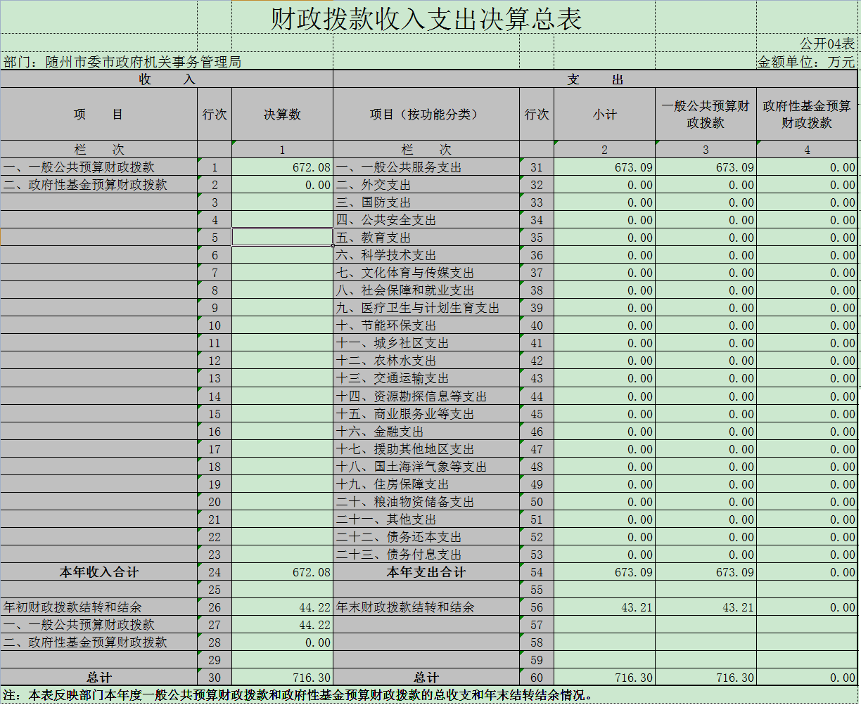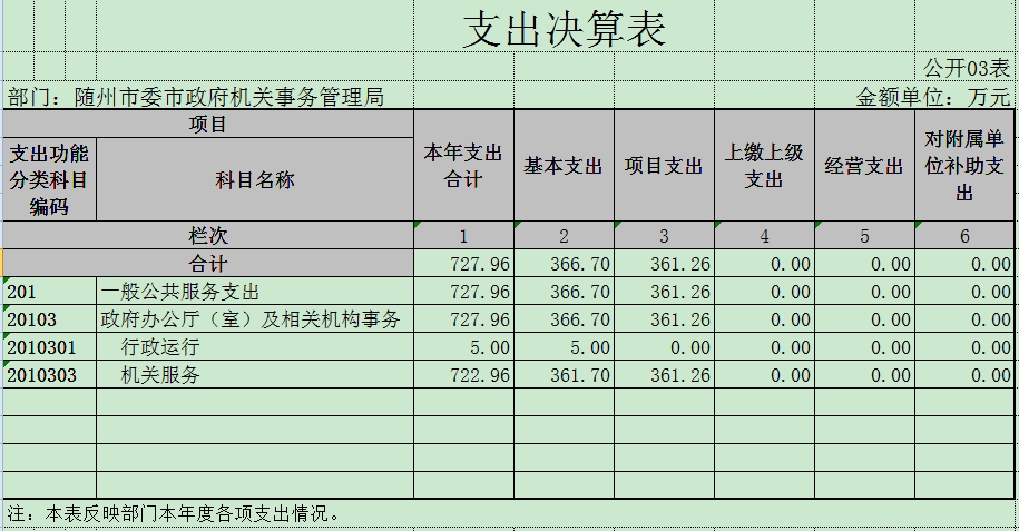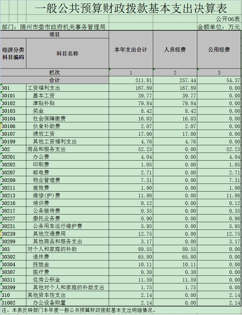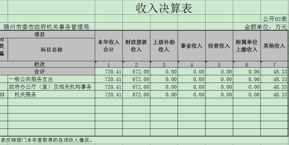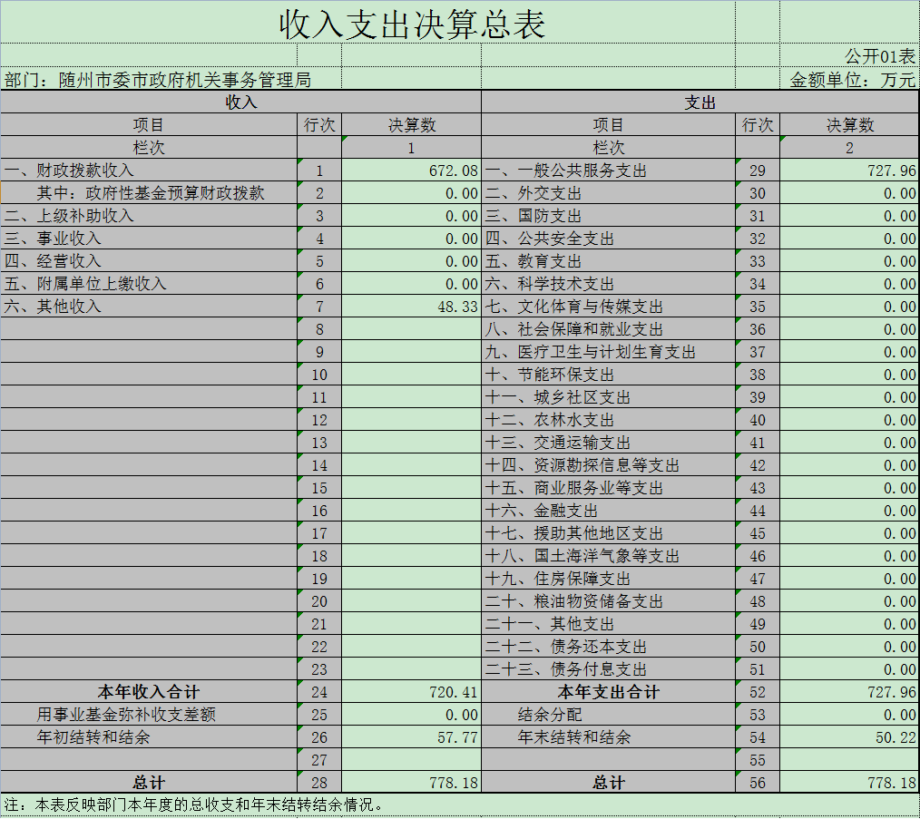 本年度收入720.40万元,其中财政拨款672.10万元(基本支出拨款310.80万元,项目支出拨款361.30万元),其他收入48.30万元(光伏发电电费和光伏发电补贴24万元,收会议中心会议费7万元,政法委装修会议室款15万元,其他2.3万元)。本年度支出728万元,其中基本支出366.7万元(人员经费287.70万元,日常公用经费79万元),项目支出361.30万元(市委市政府后勤服务维修)。上年结转57.80万元,本年度结转50.20万元。