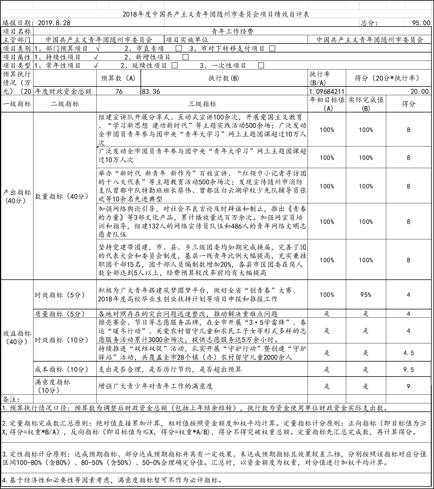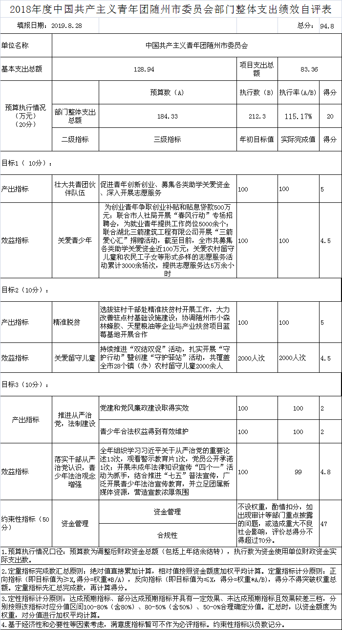 2018年我单位预算项目1个,项目名称为:青年工作经费。2018年项目预算数共计76.00万元,收入完成数共计86.32万元,收入完成率113.58%。2018年项目实际支付数83.36万元,支付完成率为109.68%。我单位2018年无预算调整,年初我单位共预算1个项目,青年工作经费项目已按项目完成进度支付,资金管理、费用标准及支付均符合相关制度的规定,支付手续齐全、凭证合法、有效。