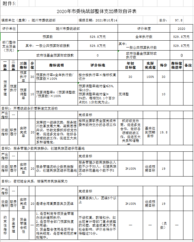 附件:2020年度市委统战部整体支出绩效自评表