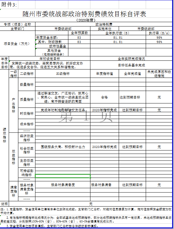 政治特别费、民族宗教工作经费项目绩效自评综述:项目全年预算数为125万元,执行数为118.6万元,完成预算94%。主要产出和效益:一是发挥统一战线优势,在服务随州改革发展大局中彰显了新作为;二是凝聚思想共识,在协助党委抓好政党协商,促进多党合作中展现了新活力;三是做好各领域统战工作,在促进五大关系和谐稳定,推动统战工作中涌现了新亮点;四是推动民族团结、加强了城市民族服务管理,加强了宗教团体建设和团结信教群众工作;五是成功争取国台办联合主办寻根节,对台影响不断扩大,炎帝文化的凝聚力和向心力不断增强;六是以寻根节为契机,充分利用侨务资源,组织嘉宾对接本地特色产业和龙头企业,利用“华创会”引智引资平台组织企业参与对接、洽谈、实现签约多个项目,为随州招商引资作出贡献。发现的问题及原因。一是项目资金未能完全发挥出预计效应,项目资金产生的效果不甚明显;二是绩效目标的设定不够科学,有部分绩效目标设定过低,改进措施:根据以往该项目的实际开展情况,结合往年项目绩效考评报告,科学、合理设定绩效目标,并有效开展工作。