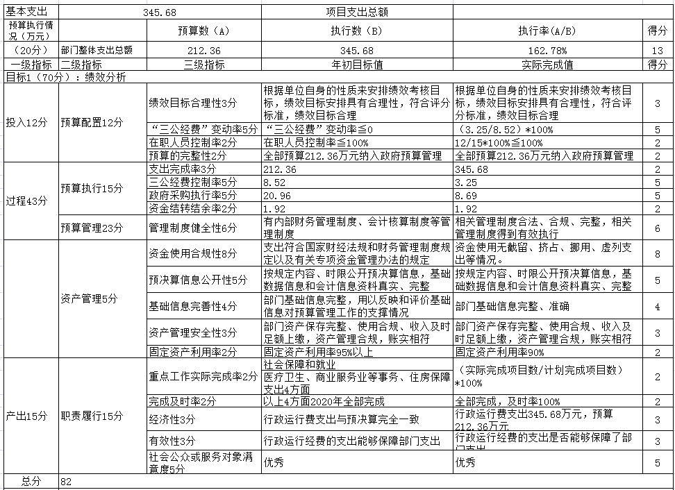 对比2020年的预决算数据, 2020年预算支出总金额345.68万元,支出调整预算数345.68万元,整体支出预算完成率为100%。2020年公用经费控制率、支出预算完成率、“三公”经费控制率等多项管理效率指标均已完成。