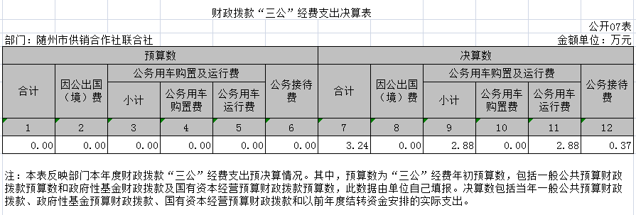 2020年“三公”经费支出3.24万元,其中公务接待费支出0.37万元,接待8批次50余人次、公务用车运行费2.88万元、出国费用支出为0元,比2019年“三公”经费支出23.77万元减少20.53万元,减少比率86.37%,减少的主要原因:单位在2019年新购置应急公务用车一辆,支出金额20.26万元。比年初预算8.52万元减少5.28万元,减少比率61.97%,主要原因:本着节省开支,减少“三公”经费支出。