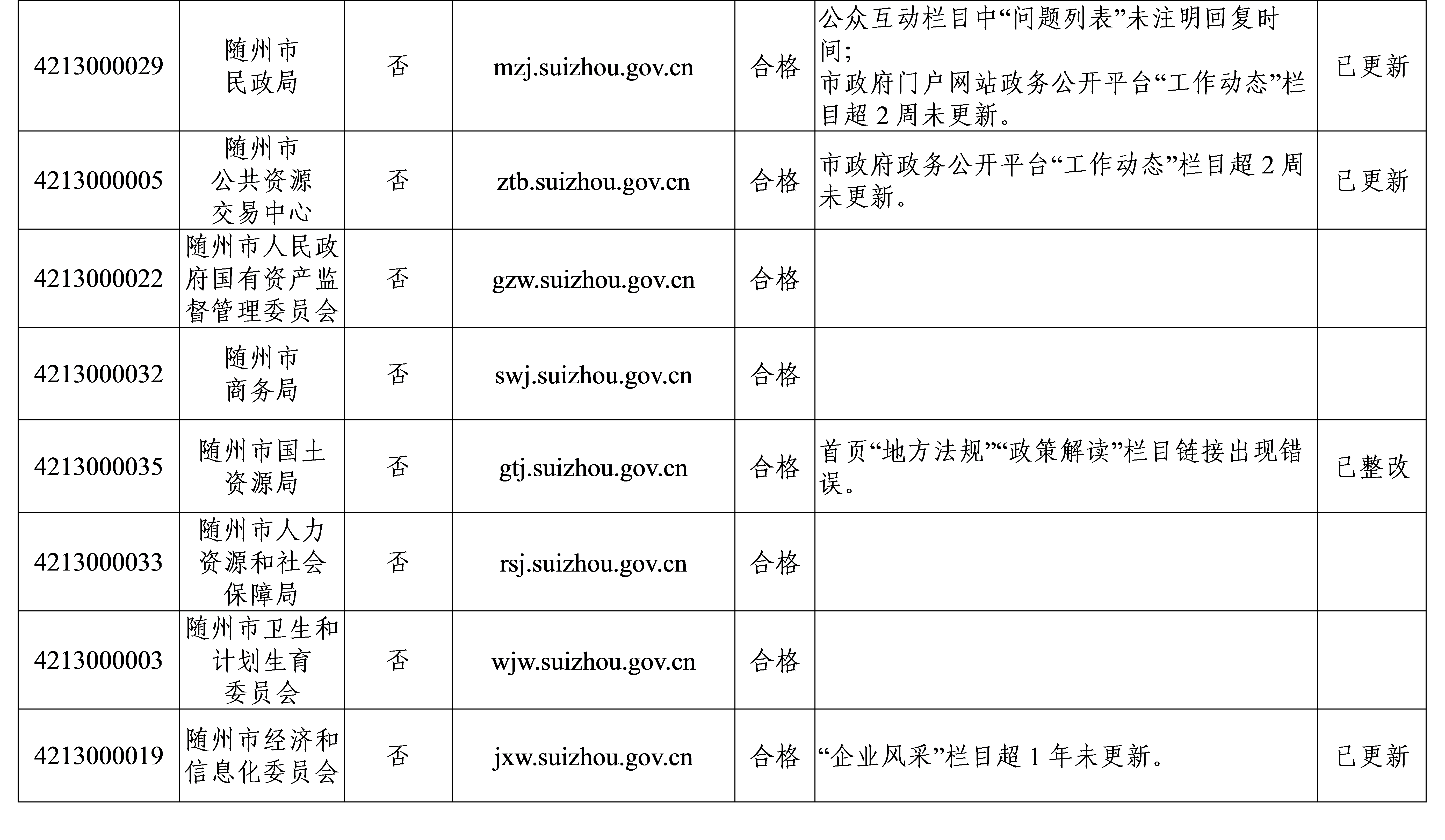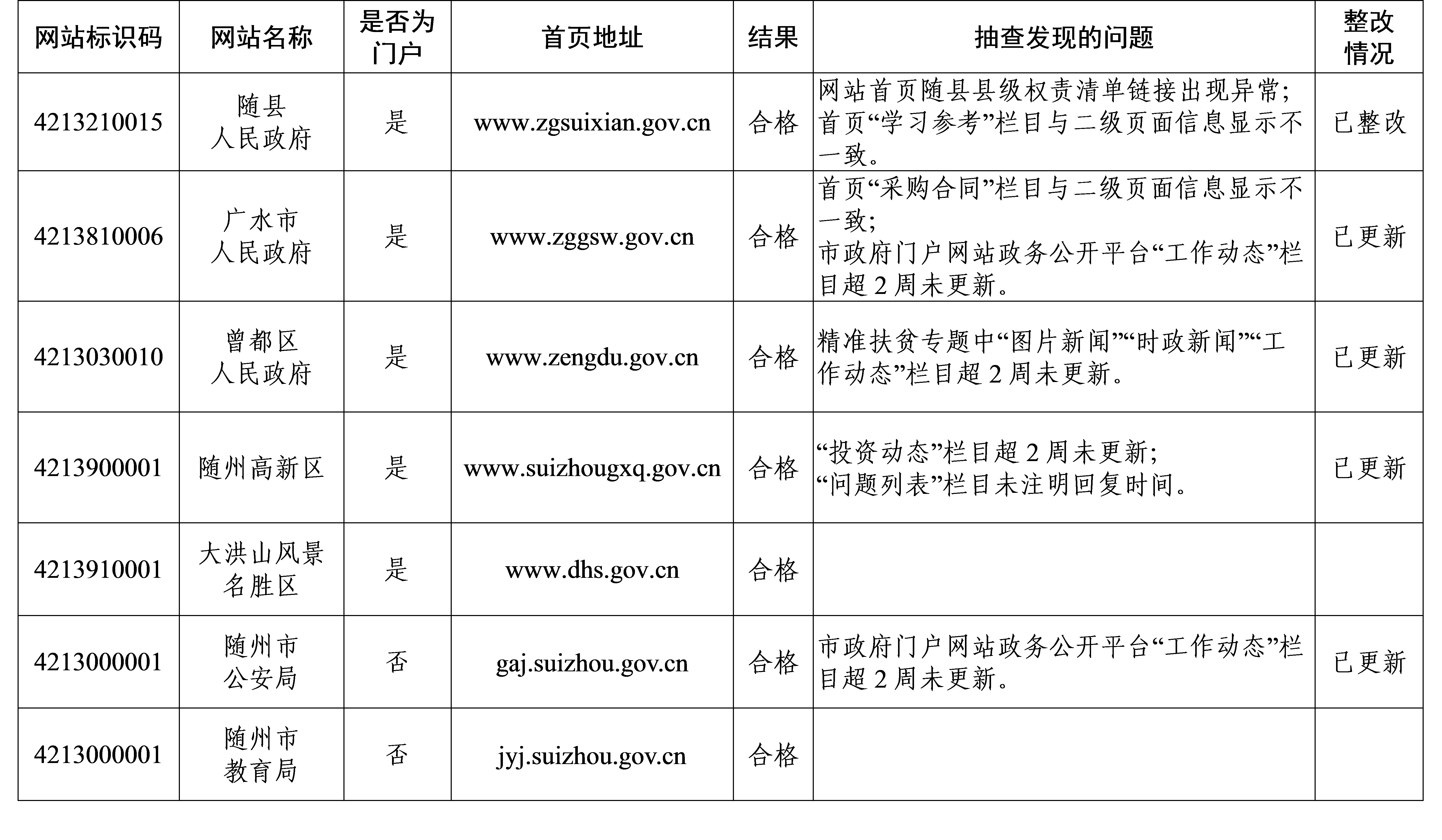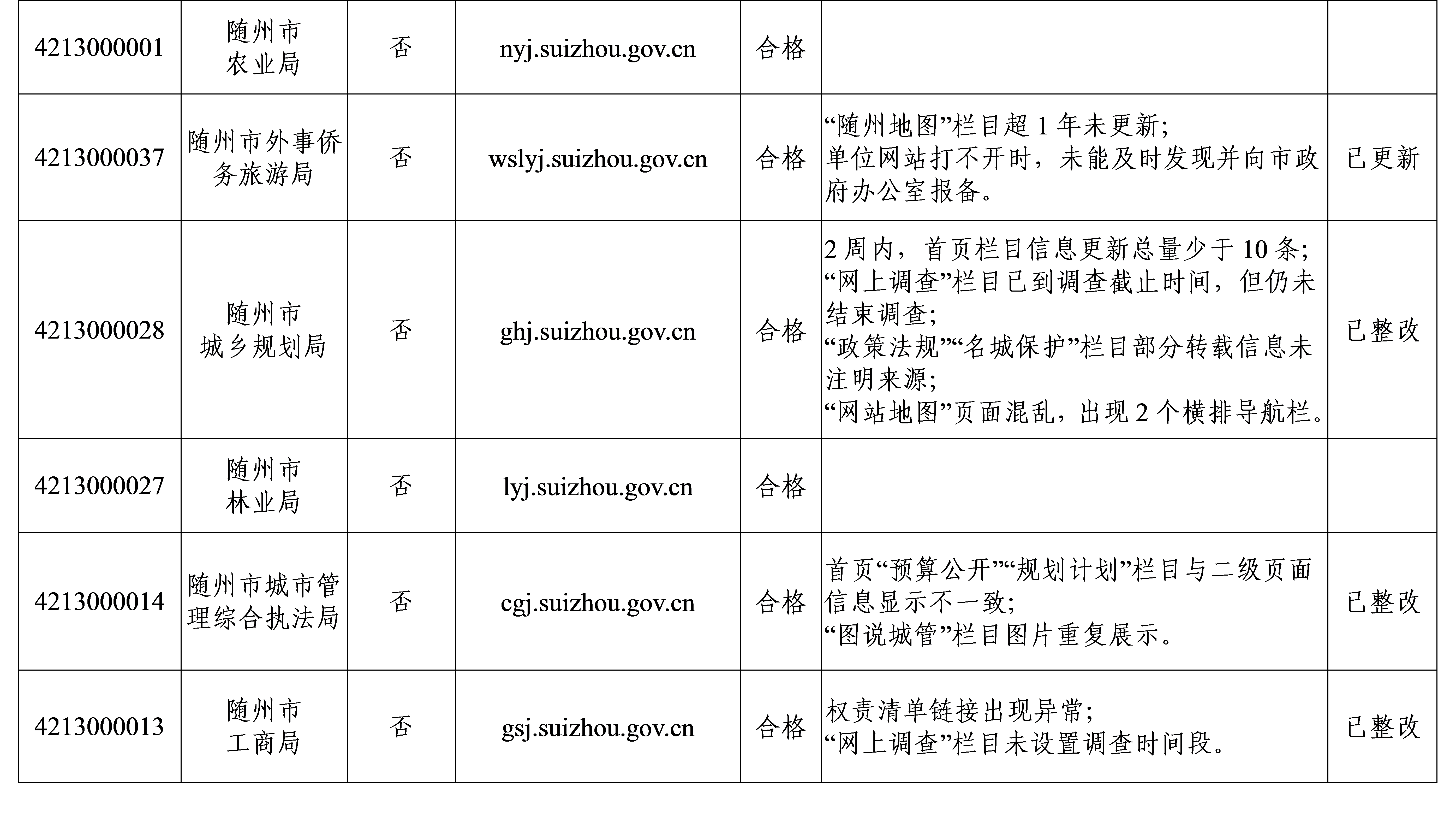 (六)第三季度各地各部门政府网站自查工作情况。本季度未按规定时间报送网站自查工作情况的单位为随州高新区、市规划局、市经信委、市公共资源交易监管局、市民政局。