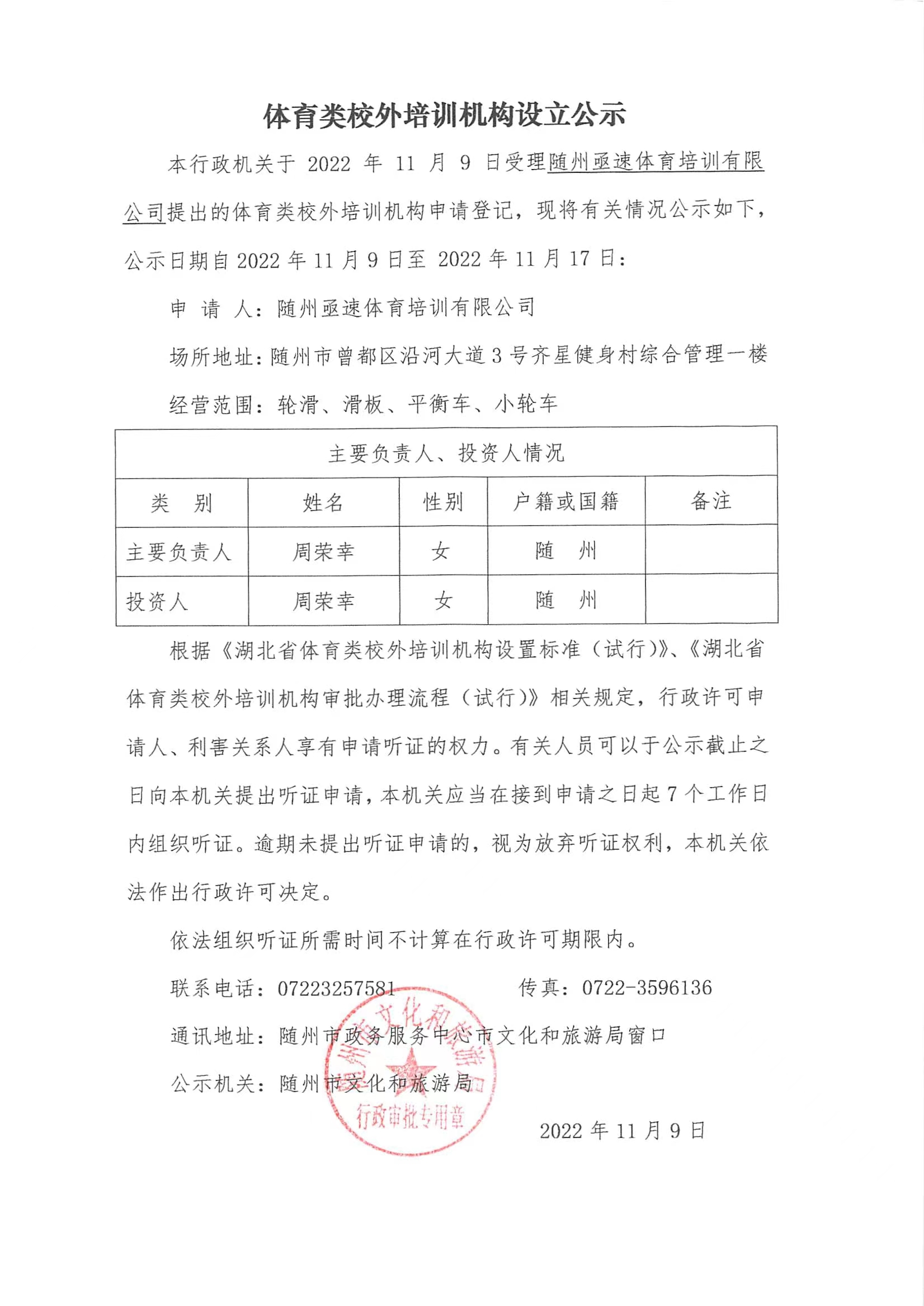 本行政机关于2022年11月9日受理随州亟速体育培训有限公司提出的体育类校外培训机构申请登记,现将有关情况公示如下,公示日期自2022年11月9日至2022年11月17日: